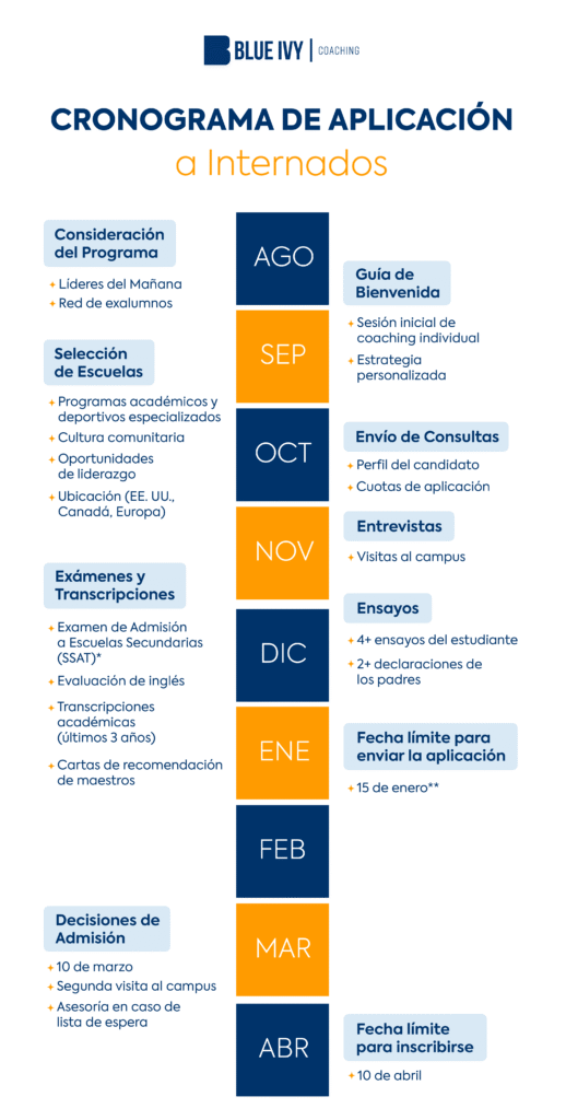 Este es un cronograma ideal para garantizar que las aplicaciones sean lo más competitivas posible. Nuestro programa se adapta a las necesidades de cada estudiante según los requisitos de las escuelas seleccionadas.